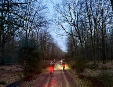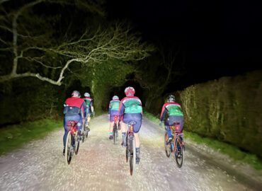 On reaching Brock, the group grew by two, with Mike joining for his first GnG, and Stu having accidentally come out with someone else’s legs – there was no stopping him this week! A quick tarmac detour to avoid the worst of Royden Woods, it wasn’t long until the crunch of New Forest gravel was audible once again. After swooping through the woods, the route takes in a short, sharp, root-filled, bumpy off-road climb, which reduced the pack to a line of individuals sensibly pacing their own way to the top. Lit by the remains of a total lunar eclipse, a quick traverse across a field and onto a tight track with fences on either side, where Mike’s front wheel was taken out by a log buried in the mud, and he had an unexpected encounter with a fence. |