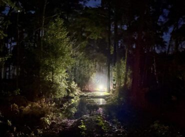 On reaching Brock, the group grew by two, with Mike joining for his first GnG, and Stu having accidentally come out with someone else’s legs – there was no stopping him this week! A quick tarmac detour to avoid the worst of Royden Woods, it wasn’t long until the crunch of New Forest gravel was audible once again. After swooping through the woods, the route takes in a short, sharp, root-filled, bumpy off-road climb, which reduced the pack to a line of individuals sensibly pacing their own way to the top. Lit by the remains of a total lunar eclipse, a quick traverse across a field and onto a tight track with fences on either side, where Mike’s front wheel was taken out by a log buried in the mud, and he had an unexpected encounter with a fence.